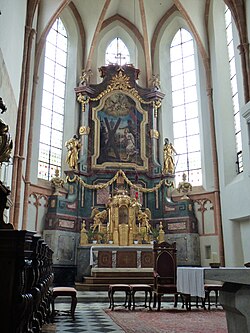| Dieses Bild zeigt das in Österreich unter der Nummer 86295 denkmalgeschützte Objekt. ( Commons , de , Wikidata ) ehemalige Stiftskirche Göss (bei Leoben, Steiermark): Hauptaltar | Eigenes Werk | Niki.L | Datei:Göss Hauptaltar.jpg |