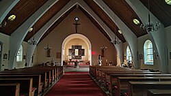 Oberhalb des Einganges befindet sich ein Fresko einer Schutzmantelmadonna. Die Orgel aus 1999 stammt von Wolfgang Bodem.[1]