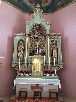 Der Hochaltar um 1858 ist ein frühhistoristisches Retabel mit einem Relieftondo Maria Hilf und trägt die Statuetten der Hll. Georg, Leonhard, Sebastian, Florian und seitlich die Statuen der Hll. Rupert, Virgil, Gregor (?) und Hieronymus.