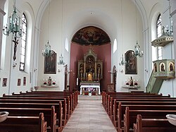 Das vierjochige Langhaus hat ein Tonnengewölbe auf Gurtbögen und Pilastern. Die zweigeschoßige Westempore hat abgefaste Marmorpfeiler. Die Apsis mit einem Dreiseitschluss hat ein Tonnengewölbe. Die Fenster haben eine Versprossung mit Maßwerkformen mit einer ornamentalen Verglasung aus der Bauzeit. Das Wandbild Krönung Mariens im Apsisgewölbe malte Sebastian Stief (1856).