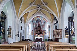Das Kircheninnere zeigt sich mit einem dreischiffigen Langhaus. Das vierjochige Langhaus, das vierte Joch ist am Boden um vier Stufen erhöht, trägt ein Netzrippengewölbe mit Kurvaturen und Rippen welche 1897 erneuert wurden, die Rippen gehen auf halbrunde Dienste mit einfachen Kapitellen. Die dreijochigen Seitenschiffe tragen ein barockes Kreuzgratgewölbe mit Stuckspiegeln. Der Triumphbogen ist spitzbogig. Der Chor mit einem Fünfachtelschluss hat ein vermauertes Achsfenster mit gotischem Maßwerk am Chorhaupt, der Chor hat Portale mit abgefasten Türumrahmungen mit geradem Sturz, im Norden zum Turm, im Süden zur Sakristei, über dem Sakristeiportal ist ein Oratoriumsfenster.