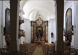 Die Kirche hat drei Joche mit dem Turm im Osten und eingezogener runder Apsis. Das erste Joch mit abgerundeten Ecken ist kürzer. Die Orgelempore darüber ruht auf zwei quadratischen Säulen und hat eine Holzdecke und oben ein Platzlgewölbe. Das mittlere Joch ist breiter (fast quadratisch) mit abgeschrägten Ecken und steilerem Gewölbe, das dritte Joch hat schmälere abgerundete Nischen (zugemauerter Ausgang zum ehemaligen Friedhof und gegenüber Sakristeiausgang) und ebenfalls ein flacheres Gewölbe. Daran schließt die eingezogene kreissegment- bzw. korbbogenförmige Apsis mit Halbkuppel an. Zwischen den Jochen sind jeweils Doppelgurtbögen. Das kräftige, durchgezogenes Hauptgesims hat dazwischen ein Fries und schließt mit einem kleineren Gesims. Unter den Gurten sind jeweils zwei Pilaster.[3]