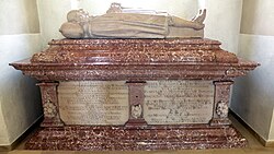 | Reichsgraf Joachim Enzmilner von Windhaag bei Perg in Oberösterreich (1600-1678). Windhagerischen Kenotaph an der Seitenwand des Langhauses der Kirche in Münzbach in Oberösterreich. Am Kenotaph liegend ist Joachim Enzmilner in spanischer Hoftracht dargestellt. Die Inschriften auf den vorderen Steintafeln hat er zu Lebzeiten selbst verfasst. LINKE Steintafel, Übersetzung des lateinischen Textes: Dem Einen und Dreieinigen Gott, dem Urheber des Glaubens! Durch dessen Gnade hat Joachim des Heiligen Römischen Reiches Graf von und zu Windhaag usw. infolge des ihm von Ferdinand III. übertragenen Amtes eines Generalkommissärs die verruchte Heräsie in Niederösterreich ausgerottet und diese Kirche wiederhergestellt, von ihm vergrössert und ausgeschmückt und aus schuldiger Dankbarkeit sich in ihr ein Grabmal ausgewählt und ihr ein Kloster zu Ehren des hl. Joachim beigefügt und es vom Grunde aus errichtet und ausgestattet, um so ewig zu leben und Gott Loblieder zu singen durch die Diener Gottes, die Brüder des Predigerordens, und dies hat er sich lebend dem Sterblichen gesetzt. Seinen sterblichen Teil, den er am 21. Februar 1600 angezogen, hat er abgelegt im Jahre 1675 richtig 1678 am 21. Mai. RECHTE Steintafel, Übersetzung des lateinischen Textes: Gott dem Allgültigen, dem Grössten! Der Maria Baronin von und zu Windhaag Maria Magdalena geborene Kirchstetter (1608-1659), seiner süssesten und tadellosen Gemahlin, hat, damit sie mit der Zeit ebenso des Grabes als des Ehebettes Genossin sei, der betrübte Gemahl Joachim des Heiligen Römischen Reiches Graf von und zu Windhaag, dieses gesetzt eingedenk seiner Pflicht als auch des Glaubens, seine Liebe durch irgendwelchen Beweis seiner Anhänglichkeit bezeugend, bis es der Gottheit gefällt, sie im Grabe zu vereinen und zu den Umarmungen seines Erbarmens zu erwecken. Geboren 19. Mai 1608. Verschieden aber am 10. März 1655 richtig am 9. März 1659. - Die zugehörige Windhagerische Gruft befindet sich in der Mitte des Langhauses der Kirche in Münzbach in Oberösterreich. Die Bodenplatte trägt die Inschrift SEPULTURA WINDHAGIANA 1659 und das Bronzerelief des Enzmilner-Wappens. Joachim Enzmilner wurde 26. Mai 1678 dort beigesetzt. | Eigenes Werk | Pfeifferfranz | Datei:Kenotaph Enzmilner.jpg | |
