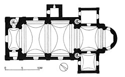 Einem kurzen eingezogenen Emporenjoch im Nordwesten folgt das zweijochige Langhaus, das durch einen halbrunden Triumphbogen mit Gurtvorlagen den ebenfalls eingezogenen quadratischen Chor und die im Südosten folgende Halbkreisapsis erschließt.