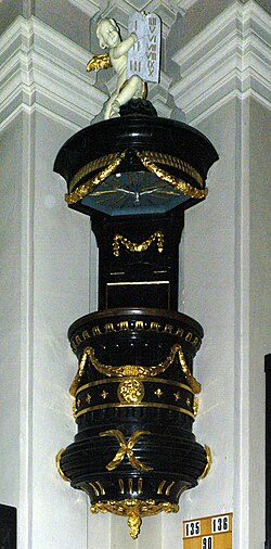 Die Kanzel mit Zopfdekor trägt auf dem Schalldeckel eine Puttenfigur mit Gesetzestafeln der Zehn Gebote.