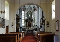 Das niedrige Langhaus ist flach gedeckt und hat eine dreiteilige kreuzgewölbte Empore, die auf Pfeilern ruht. Ein rundbogiger Triumphbogen bildet den Übergang zu dem wesentlich höheren dreijochigen und großräumigen Chor mit Fünfachtelschluss.