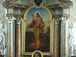 | Hochaltarbild hl. Margarethe Über dem Hochaltarbild die Allianzwappen von Johann III. Anton Pálffy (1642 - 1694) und seine zweite Ehefrau Eleonora, geb. Mollart. Für Mollart Wappen siehe auch: http://img.zvab.com/member/80333r/49923785.jpg oder https://commons.wikimedia.org/wiki/File:Wappen_der_Grafen_von_Mollart_1761.png | Eigenes Werk , BSonne , 2013-08-22 | Carl Wurzinger | Datei:Marchegg Pfarrkirche2.jpg | |