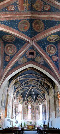 Die Fresken im Chor der Pfarrkirche entstanden in zwei Arbeitsphasen. Aus der ersten Phase, kurz nach der Fertigstellung des Chorraumes (um 1367), stammen die nur noch fragmentarisch erhaltenen Bildnisse der zwölf Apostel unterhalb der Fenster des Chorabschlusses und der von den Evangelistensymbolen gerahmte Pantokrator in Regenbogenmandorla im Gewölbe.