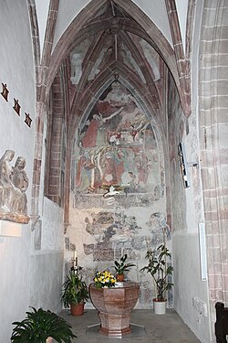 An der Nordwand des Seitenschiffes sind mehrere mittelalterliche und frühneuzeitliche Grabsteine aufgestellt, sie sind dem Geistlichen Heinrich († 1367), Sigismund von Niedertor († 1412), Georg Schenk († 1432), Georg Hafner († 1630) und Anna Barbara Burger († 1691) gewidmet.