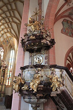 Die Kanzel wurde laut Inschrift 1769 gestiftet und wird Michael Zill zugeschrieben. Die Fassung wurde von Johann Peter Marx durchgeführt. An der Brüstung des Kanzelkorbes sitzen die Statuen der vier Evangelisten. Die Rückwand bildet ein Metallrelief-Tondo mit der Darstellung der Maria Magdalena. Auf dem Schalldeckel steht die Figur des Apostels Paulus von fünf Putten umgeben. Den Abschluss bildet das Auge Gottes in einem Strahlenkranz. An der Unterseite des Schalldeckels ist eine Heilig-Geist-Taube angebracht. An der Korbinnenseite befindet sich ein Chronogramm, dessen Inschrift „MathIas VaLentIn PaCher hat Diese Fächer KanzeL hierher neV aVfsetzen Lassen“ die Jahreszahl „1769“ ergibt.