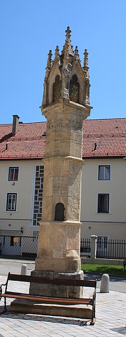 Die spätgotische Lichtsäule vor der West-Fassade der Stadtpfarrkirche ist mit 1477 bezeichnet. Sie ist eine Stiftung der Bruderschaft der Schuster und Lederer. Sie besteht aus einem hohen achteckigen Schaft, einem Lichthäuschen mit krabbenbesetzten Giebeln und Eckfialen.[2]