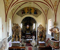 Im vierjochigen Langhaus erhebt sich ein Kreuzrippengewölbe mit bemalten Schlusssteinen über Wandvorlagen mit polygonalen und gebündelten Diensten, die in den Ecken in Konsolköpfen enden. Die Westempore mit Maßwerkbrüstung und Mittelerker ist mit spätgotischen Netzrippen unterwölbt. Ein rundbogiger, barock verkleideter Triumphbogen verbindet das Langhaus mit dem einjochigen Chor mit Fünfachtelschluss. Im Chor ruht ein Kreuzrippengewölbe mit reliefierten Schlusssteinen auf Runddiensten und Kopfkonsolen. Die Chorfenster wurden barock erneuert. An der Chornordwand befindet sich eine vermauerte schulterbogige Öffnung, die wohl der Einstieg zum Obergeschoß einer spätgotischen Sakristei war. Weiters befinden sich im Chor eine gotische Sakramentsnische mit Gitter aus dem 14. Jahrhundert und ein barocker Taufstein.