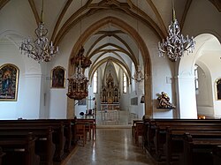 Die Kirche wurde als einschiffiges Bauwerk errichtet. Im 17. Jahrhundert wurden zwei Seitenkapellen angebaut. Im Jahr 1699 musste die durch einen Brand zerstörte Kirche neu errichtet werden. Der Hauptaltar ist im neugotischen Stil gestaltet. Auf einem, dem heiligen Florian geweihten, Altar ist eine Ortsansicht aus dem Jahr 1750 zu sehen. In der Kirche stehen zwei von Hans Brandstetter gestaltete Statuen.[1]