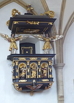 | Moosbach ( Oberösterreich ). Pfarrkirche hl. Petrus ( 16.Jhdt. ) - Barocke Kanzel ( 1670 ) | Eigenes Werk | Wolfgang Sauber | Datei:Moosbach Pfarrkirche - Kanzel 1.jpg | |