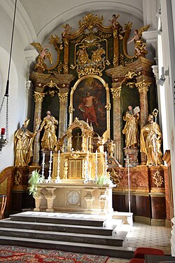Die Einrichtung der Kirche stammt aus der Bauzeit. Den Hochaltar mit den Figuren schuf nach 1767 der Bildhauer Philipp Jakob Straub, das Altarbild malte der Maler J. V. Hauckh (1713) und die Orgel baute 1852 Alois Hörbiger.