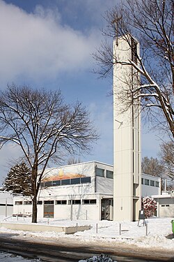 Die Kirche ist baulich ein Pfarrzentrum mit Kirche, Kapelle, Kirchturm, Pfarrhof und Pfarrheim. Der Flachbau hat einen integrierten – zur Siedlung Neu-Guntramsdorf offenen Kirchplatz. Die Kirche ist ein rechteckiger streng gegliederter Saalbau mit Betonträgern und hat im Eingangsbereich wie auch im Emporenbereich horizontale Schlitzfenster. Die Glasmalerei schuf Charlotte Klima. In der Werktagskapelle ist ein Glasfenster von Walter Eckert. Die Orgel aus 1982 mit 6 Registern wurde von Orgelbau M. Walcker-Mayer gebaut.[1]
