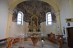 Im Altarraum ist eine Wandmalerei mit dem Motiv Anbetung der Dreifaltigkeit. Am 21. Mai 2010 weihte Paul Iby, Bischof von Eisenstadt den neuen Volksaltar. Die Altarplatte besteht aus 220 Millionen Jahre altem versteinertem Holz aus Arizona. Sie enthält Mineralien wie Jaspis, Achat und Chalzedon. Der Unterbau besteht aus sehr alten Baumwurzeln. Ambo und Kerzenleuchter sind im selben Stil gehalten. Unter dem Volksaltar wurden Reliquien des heiligen Celsus, des heiligen Donatus, der heiligen Victoria und des seligen Ladislaus Batthyány-Strattmann eingemauert.[2] Die Orgel aus 1911 mit 8 Registern stammt von Gebrüder Rieger.[3][4]