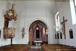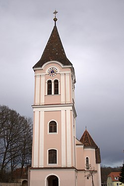 Die Kirche wurde 1418 erstmals urkundlich genannt und war bis um 1620 eine Filialkirche von Wörth. Der gotische Bau mit barocken Erweiterungen und Zubauten erhielt 1968 eine markante Einrichtungsumgestaltung.
