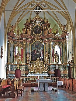Der barocke Hochaltar von 1780 mit Opfergangsportalen ist ein Werk des Tischlers Georg Zaderer und des Bildhauers Johann Maier. Der Altar mit dreiachsigem Aufbau, vorgeblendeten Säulen und konkaven Seitenteilen nimmt die volle Höhe und Breite des Chorschlusses ein. Der Tabernakel ist mit figürlichem Schmuck ausgestattet. Das Mittelbild mit der Himmelfahrt Mariens wurde wahrscheinlich von Siegmund Schneider aus München gemalt. Die überlebensgroßen Figuren stellen die Heiligen Petrus und Johannes den Täufer sowie Josef und Paulus dar. Das Aufsatzbild zeigt den seinen Mantel teilenden, heiligen Martin. Flankiert wird das Bild von den Statuetten zweier heiliger Bischöfe sowie von vier musizierenden Engeln. Den Abschluss des Altars bildet eine spätbarocke Uhr.