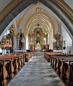 Das einschiffige, dreijochige Langhaus ist ein wenig breiter als der Chor. Im Langhaus erhebt sich ein Sternrippengewölbe über abgefasten Wandpfeilern mit jeweils halbrunder Vorlage. Die Drei- und Vierpassschlusssteine sind bemalt und zeigen ein menschliches Gesicht, zwei gekreuzte Hämmer im roten Wappenschild und ein blaues Schild mit Ornamenten. Die gemauerte, spätgotische Empore im Westjoch mit durchbrochener Maßwerksbrüstung steht auf einer konkav geführten dreiteiligen Spitzbogenarkatur mit Sternrippenunterwölbung.