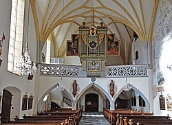 Die Orgel hat ein mechanisches Werk aus der Passauer Orgelbauschule aus dem 17. Jahrhundert. Die insgesamt 1238 Pfeifen stammen zum Teil noch aus dem 16. Jahrhundert. Der Orgelkasten wurde um 1700 gefertigt. Die Flügel der Orgel sind innen mit der heiligen Cäcilia und dem König David bemalt. Auf den Flügelaußenseiten ist die Verkündigungsszene dargestellt. Der auf Holz gemalte Doppeladler an der Nordwand der Orgelempore ist mit 1765 datiert. An der Empore sind zwei um 1520 aus Kirschholz geschnitzte, ungefasste Statuen der Heiligen Barbara und Margareta angebracht. Die um 1515 gefertigten Betstühle auf der Orgelempore sind mit Ornamentik an den Wangen und am oberen Rand ausgestattet und haben die Inschrift: “Tempora mutantur, homines deteriorantur. Qui veritatem dicit, caput fratem hebebit. Audi, vide, tace, si vis vivere in pace”.