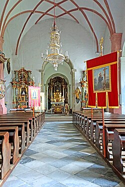 Das romanische, fünfjochige Kirchenschiff wird von einem Netzrippengewölbe überspannt, welches auf abgefasten, barockisierten Wandpfeilern ruht. An das Langhaus schließt das Chorquadrat mit niedrigen Rundbögen aus Quadersteinen mit Kämpferprofilen. An der nördlichen Mauer des Chorquadrates befinden sich die Reste eines verstäbten, spätgotischen Portals mit gedrehten Basen. An das Chorquadrat schließt die niedrige Halbkreisapsis, welche fast gleich breit wie der Kirchturm ist. Unter der Apsis befindet sich eine kleine, achteckige Krypta. Nördlich an das Chorquadrat ist eine einjochige, gotische, ehemalige Kapelle angebaut, welche heute als Sakristei genutzt wird. Diese hat einen Fünfachtelschluss und wird von einem auf Halbkreisdiensten sitzenden Kreuzrippengewölbe überwölbt. Eine zweijochigeTaufkapelle mit einem Kreuzgratgewölbe schließt nördlich an das Langhaus an. An der südlichen Langhausmauer befindet sich der Anbau einer rechteckigen Kreuzkapelle mit Kreuzrippengewölbe und Eierstab-Stuckleisten aus dem 17. Jahrhundert. Im westlichen Teil des Langhauses befindet sich die dreiachsige, von einem Kreuzgratgewölbe unterwölbte Empore. Der Zugang zur Kirche erfolgt im Westen durch ein einmal gestuftes, romanisches Rundbogenportal mit zwei Knospenkapitellen. Alle Fenster im Kirchenschiff sind barockisiert, mit der Ausnahme eines romanischen Fensters an der Südseite. Die Rundbogenfenster in der Apsis weisen leichte, heute teilweise vermauerte Ansätze zum Spitzbogen auf.[2]