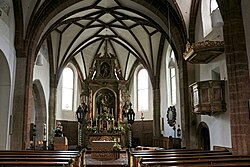 Die Kirche Mariä Geburt ist eine zweischiffige Pseudobasilika, ihr Langhaus besteht aus dem Hauptschiff und einem wesentlich niedrigeren nördlichen Seitenschiff. Die Gewölbe des Hauptschiffs setzen höher an, als die Scheitel der spitzbogigen Arkadenbögen liegen. Das Hauptschiff und der Chor sind spätgotisch, das Netzrippengewölbe hat einen sechsteiligen Rautenstern mit runden Schlusssteinen über Wandpfeilern und Runddiensten, im Chor auf Diensten mit Rundkapitellen. Das vierjochige Langhaus hat im Westen eine Holzempore aus 1672 mit einem südlichen Balkon über das zweite Joch als Zugang zum Turmobergeschoß mit einem spätgotischen kielbogigen Portal. Im vierten Langhausjoch ist südlich ein spätgotisches rundbogiges abgefastes Sakristeiportal. Der einjochige Chor schließt mit einem Fünfachtelschluss. Das nördliche viereinhalbjochige barocke Seitenschiff unter einem Pultdach ist im Westen gegenüber dem Hauptschiff verkürzt und hat ein gekehltes Rundbogenportal mit der Jahresangabe 1735, im ersten Halbjoch ist ein Aufgang zur Empore des Hauptschiffes, in den drei folgenden Joche habe Gewölbe aus Stichkappentonnen mit Gurtbögen auf Pilastern mit profilierten Kapitellen, das vierte Joch ist ein Kreuzgratgewölbe in der Länge des Chorjoches. Im Süden befinden sich beidseits des Turmes eingeschoßige Anbauten unter einem Pultdach, östlich die Sakristei.