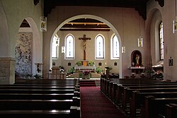 Das Kircheninnere wurde durch den Wiederaufbau 1948/1949 stark verändert, insbesondere durch die flache Decke aus Holz und die gezimmerte Empore mit vertäfelter Brüstung. Zwei weit gespannte Pfeilerarkaden verbinden das Hauptschiff zum Seitenschiff unter einer schwibbogengeteilten Kassettendecke und einem großen Frontbild Legende des hl. Vitus vom Maler Hans Alexander Brunner aus 1958. Ein eingezogener Triumphbogen öffnet das Hauptschiff zum Polygonalchor unter einer Flachdecke. Das Turmerdgeschoß hat ein erhaltenes Sternrippengewölbe teils auf Wappenschildkonsolen, eine Konsole nennt 1498. Die abstrakte Glasmalerei im Chor schuf Godi Hirschi 2002.