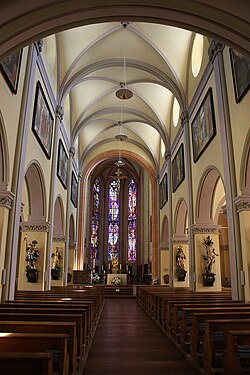 An den Hochwänden des Mittelschiffes sind acht Bilder, ein Bild nennt Josef Gold (1911–1912). Die spitzbogigen Maßwerkfenster im Chor zeigen Glasgemälde von Josef Widmoser (1959).