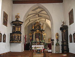 Die Kirche verfügt über einen aus der Mitte des 18. Jahrhunderts stammenden barocken Hochaltar mit Rundsäulenarchitektur. Das frühbarocke Altarbild zeigt den Kirchenpatron. Links vom Altar befindet sich die Statue einer weiblichen Märtyrerin mit Kreuz und rechts die Statue der heiligen Apollonia. Im Auszug sieht man Gott in den Wolken zwischen dem heiligen Nepomuk und dem heiligen Aloisius. Tabernakel, Pieta sowie die Heiligenstatuen Joachim und Anna stammen von Balthasar Melber aus Enns und sind mit 1730 zu datieren.