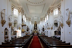 Die Inneneinrichtung erfuhr erst 1774 ihre weitgehende Fertigstellung. Sie besticht durch ihre Helligkeit und ist in Weiß-Gold gehalten. Der Innenraum enthält Elemente des Spätbarock und Frühklassizismus.[3] Der längsgestreckte Saal ist ca. 50 m lang, 15 m hoch und 12 m breit und wölbt sich kreuzförmig in zwei Seitennischen aus.