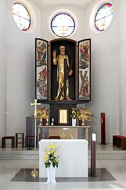 Der zweiflügelige Hochaltar aus dem Jahr 1937 ist ein Werk des Bildhauers Wilhelm Bormann. Die Figur stellt den heiligen Andreas dar. Davor steht, an der Grenze zum Langhaus, der Volksaltar und der Ambo, dahinter befindet sich die Sessio.[3]