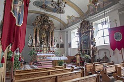 Die Kanzel aus dem späten 18. Jahrhundert zeigt das Bild Christus in Emmaus vom Maler Anton Eggl (1873). Ein Kruzifix und eine Rosenkranzmadonna sind aus der 2. Hälfte des 18. Jahrhunderts. Die Kreuzwegstationen sind aus dem späten 19. Jahrhundert.