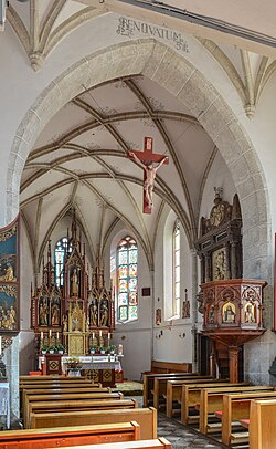 Die spätgotische Hallenkirche ist dreijochig. Darüber ist Kreuzrippengewölbe. Der zweijochige Chor ist eingezogen und netzrippengewölbt. Der Chor schließt im 3/8-Schluss. Die Sakramentsnische ist spätgotisch. Im linken und rechten Chorfenster sind Glasmalereien aus der Zeit um 1400. Links ist der „heilige Nikolaus im Schiff“ dargestellt, auf der rechten Seite „Mariä Heimsuchung“. In der Sakristei befindet sich eine Wappenscheibe mit dem Wappen der Grienthaler von 1583.
