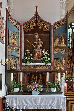 In den neugotischen Seitenaltären sind Überreste gotischer Flügelaltäre eingearbeitet. Im linken Seitenaltar ist im Schrein eine vollplastische sitzende Madonnenstatue dargestellt. Es handelt sich um eine schwache Arbeit aus der Mitte des 14. Jahrhunderts. Die Gewandung und das Kind wurden in späterer Zeit ergänzt. An den Innenseiten der Flügel sind Reliefs der „Heimsuchung“, „Verkündigung“, „Weihnachten“ und die „Anbetung der Könige“. An der Außenseite der Flügel sind vier weibliche Heilige aus der Zeit um 1520 gemalt. Im Staffelschrein unter der Madonnenfigur ist eine Gruppe „heilige Anna selbdritt“ vom Anfang des 16. Jahrhunderts. An den Flügeln ist außen „Christus Elend“ und die „Schmerzhafte Muttergottes“ dargestellt. An den feststehenden Flügeln sind wappenhaltende Engel von ca. 1520 dargestellt.