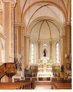 Im Innenraum der Kirche dominiert sowohl die neuromanische Architektur als auch die für das späte 18. Jhd. typische künstlerische Ausgestaltung des Kirchenraumes. Bautechnisch folgt die Architektur dem Prinzip einer Basilika. Sämtliche Heiligenfiguren sind aufwendig bemalt, sowohl Seiten- als auch der ehemalige Hochaltar wurden aus weißem Marmor errichtet. Besondere regionale Berühmtheit erlangte die Kirche für ihre vielfältige Reliquiensammlung sowie ihre durch ihre Klostervergangenheit begründete umfangreiche Ausstattung an liturgischen Geräten und Paramenten, die an Hochfesten bis heute verwendet werden.