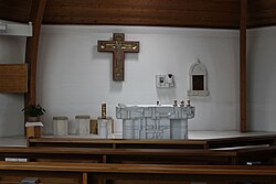 Über dem Altar ist zeigen Wandmalereien die vier Evangelistensymbole. Im Joch davor befindet sich ein Heiliggeistloch.