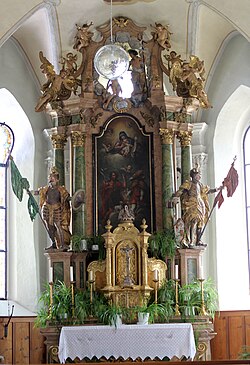 Im Ostchor der Kirche steht der barocke Hochaltar von Josef Jakob Witwer. Das Altarbild zeigt im oberen Teil die Gottesmutter mit dem Jesuskind, im unteren Bereich sind die hll. Korbinian, Laurentius und Johannes der Täufer dargestellt. Seitlich des Bildes stehen die Figuren der hll. Georg und Florian. Im Giebel des Altars befindet sich die figürliche Darstellung der Taufe Jesu im Jordan. Einige dieser Skulpturen wurden von Johann Georg Witwer geschaffen.[1]