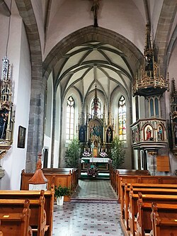 Die im Kern gotische Kirche erscheint außen durch zahlreiche Anbauten verändert. Der eingezogene zweijochige Chor mit einem Netzrippengewölbe hat einen Fünfachtelschluss. Das dreischiffige dreijochige Langhaus ist eine Staffelhalle mit Netzrippengewölbe, wobei die Jochachsen im Mittelschiff und in den schmalen Seitenschiffen um eine halbe Jochbreite gegeneinander verschoben sind, wodurch die Mittelschiffpfeiler in der Achse der Langhausfenster liegen, womit weiters durch die große Spannweite der fast halbkreisförmigen Bogen zwischen den Schiffen ein weiträumiger Eindruck entsteht. Der gotische Turm im nördlichen Chorwinkel mit einer sternrippengewölbten Glockenstube wurde 1721 barock ausgebaut, wobei die ungewöhnliche Form des Helmes Jakob Prandtauer zugeschrieben wurde.
