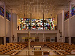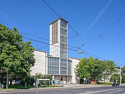 | Linz-Bindermichl, Pfarrkirche St. Michael (erbaut 1954-57 nach Plänen von Fritz Reischl). Ostfassade von der Muldenstraße aus gesehen. | Eigenes Werk | Otto Normalverbraucher | Datei:Pfarrkirche Bindermichl.JPG |