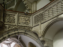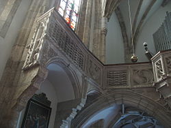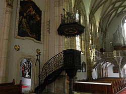 | Kirchenfestungsanlage hl. Oswald - Detail der Empore mit der rechten Kanzel. Die darin befindliche Jahreszahl meint, lt. neuesten Untersuchungen, nicht das Entstehungsjahr der Empore sondern den Beginn der Reformation. | Eigenes Werk | Haeferl | Datei:Eisenerz - Wehrkirche hl Oswald - Detail der Empore mit der rechten Kanzel.jpg |