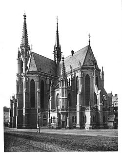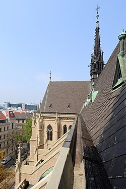 Die Seitenfronten des Langhauses sind durch abgetreppte Strebepfeiler und zweibahnige Maßwerkfenster strukturiert. Hinter einer abschließenden Dreipassbalustrade sind Lichtgaden mit gekuppelten Spitzbogenfenstern zu sehen. Auf beiden Seiten treten etwa 12 Meter lange Querschiffapsiden hervor. Auch diese sind durch zweibahnige Maßwerkfenster gegliedert. Über der Vierung befindet sich ein etwa 60 Meter hoher Vierungsturm aus Holz mit Spitzhelm, der mit Eisenplatten verkleidet ist.[23] Die Chorpartie ist mit einem Kranz durchbrochener Strebepfeiler und einem Umgang mit Maßwerkbalustrade umzogen. In den Winkeln der Querschiffe sind die fünfeckigen Windfänge der Seitenausgänge und rund um den Chorschluss mit Spitzbogenfenstern durch eine Mauer abgetrennt, die polygonalen Räume der Sakristei angeordnet. Dadurch entsteht der Eindruck eines Chorumganges.[23] Die Bildhauerarbeiten stammen von Josef Pokorny.[8]