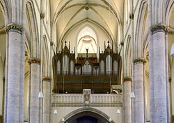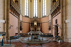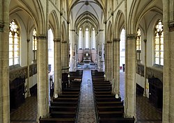 Im Inneren ist die Kirche eine dreischiffige und fünfjochige Basilika. Im östlichen Mittelschiffjoch befindet sich die Orgelempore mit Maßwerkbalustrade über einem Spitzbogen. Über den hohen Spitzbogenarkaden auf Rundpfeilern im Mittelschiff sind Lichtgaden mit gekuppelten Dreiblattfenstern. Die Rundpfeiler, die das Hauptschiff von den Seitenschiffen trennen, sind mit jeweils zwei Diensten mit Blattkranzkämpfern versehen. Die den Seitenschiffen zugewandten reichen bis zur Höhe des Kapitells der Hauptsäule, die dem Hauptschiff zugewandten bis zum Kämpfergesims.[28]