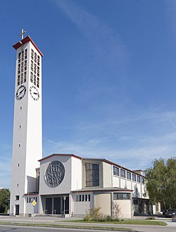 | Kath. Pfarrkirche Maria Lourdes | Diese Datei wurde von diesem Werk abgeleitet: Lourdeskirche 08.JPG : | File:Lourdeskirche 08.JPG : AleXXw derivative work: TeKaBe | Datei:Lourdeskirche 08 edit (cropped)2.jpg | |