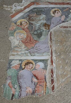 An der südlichen Schiffsaußenwand befinden sich bedeutende Wandmalereireste, die durch den Dachstuhl der Sakristei verdeckt waren und heute von der Vorhalle aus sichtbar sind. Die um 1440/50 gemalten Fresken zeigen Teile der Genesis, die Ölbergszene, die Gefangennahme Christi und den Schmerzensmann, umgeben von vier Heiligen sowie Rankenornamente.