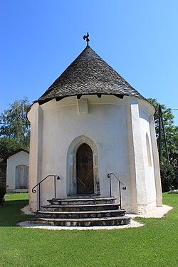Der Karner südöstlich der Kirche ist ein frühgotischer Rundbau mit Strebepfeilern, halbrunder Konsolapsis, Lanzettfenstern und einem spitzbogig profilierten Portal. An der Südseite ist ein Jüngstes Gericht aus dem zweiten Viertel des 15. Jahrhunderts zu sehen. Im Inneren ist der Karner von einer sechsteiligen Bandrippenkuppel überwölbt. Das Obergeschoß dient als Kriegerdenkmal und Aufbahrungshalle.