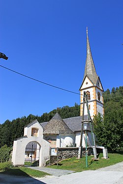 Die Kirche ist ein im Kern romanischer, geosteter Bau, der in der Gotik und im Barock verändert wurde. Das Gebäude ist eine Saalkirche, der Chor hat einen geraden Schluss. Südlich an das Langhaus sind eine Sakristei und eine Vorlaube mit dem Aufgang zur Empore angebaut. Der spätgotische Turm nördlich des Chors besitzt reiche dreibahnige Maßwerkfenster und wird von einem sechseckigen Spitzhelm bekrönt. Neben dem südlichen Schallfenster ist eine Granate aus der Zeit des Kärntner Abwehrkampfes konserviert. Die Glocke wurde 1603 von Georg Fiering gegossen. Das Dach ist mit Steinplattln gedeckt.