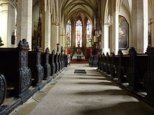 Die dreischiffige vierjochige Staffelhalle hat profilierte Spitzbogenarkaden auf Achtseitpfeilern, das Mittelschiff hat ein Netzrippengewölbe, die schmäleren Seitenschiffe haben längsoblonge Kreuzrippengewölbe, und zeigen nördlich an den Schlusssteinen reliefierte Wappen.