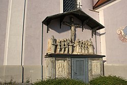 Ein Epitaph Herberstein aus dem 3. Viertel des 16. Jahrhunderts wurde 1856 aus dem Kircheninneren an die Südfront, zum Zugang der Herbersteingruft übertragen. Es besteht aus einem fast lebensgroßen Kruzifix und seitlich knienden acht männlichen und acht weiblichen Figuren in Rüstung bzw. Kostüm. An den Chorschluss wurde 1911 die Gruft der Marchese Tacoli angebaut.