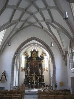 Das vierjochige Langhaus ist einschiffig und hat ein Netzrippengewölbe mit eingezogenen Streben. Die gotische Westempore über dem Eingangsbereich ist dreiachsig und lagert auf einem Netzrippengewölbe. Auf der Empore befindet sich die Orgel.